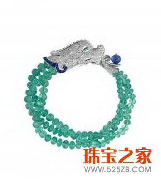 114颗重126.05克拉的祖母绿串珠,手链接口处由铂金龙头锁扣,2颗梨形切割祖母绿龙眼栩栩如生地与祖母绿串珠龙身辉映,1颗蓝宝石与龙嘴接口,显其典雅高贵。