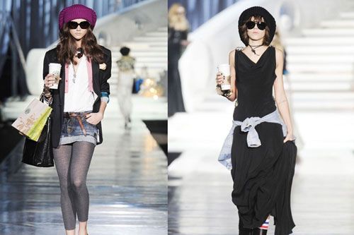 在0910秋冬米兰时装周上,深受明星喜爱的Dsquared2在秀场上表现了一回被"帕帕拉基"狗仔队包围的明星街头秀。模特带着超大墨镜、长围巾,穿着春天感觉的服装走秀,更有趣的是模特手里还拿了一杯星巴克咖啡,就好像我们一直看到的洛杉矶街头抓拍明星照一样。穿着波希米亚感觉的让人想起Mary-Kate Olsen,而复古摇滚穿着的则有些像Sienna Miller的风格。