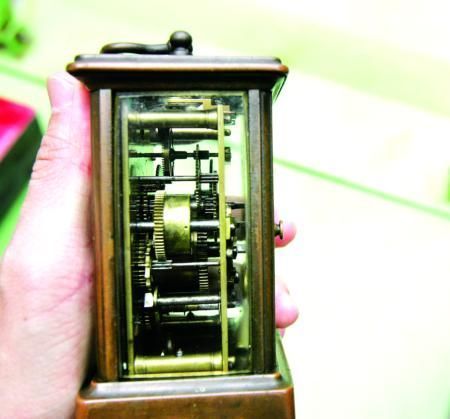 咱注意到,梁先生收藏的两个“皮桶钟”,现在还可以走,而且旋一次发条能走7天。但它们的颜色小有不同,其中一个钟面上还多了个小表盘。梁先生解释,“皮桶钟”其实也是分雌雄的,多了小表盘的那个是“雄钟”。