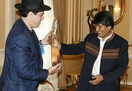 玻利维亚的总统Evo Morales是不是曾经在Los Lobos乐队里待过?他还真摇滚啊,混合《疯狂的神父》(Nacho Libre)里傻乎乎的扮相,健康又环保的一次性标准男士蓝领衬衫,加上他还有对传统服饰的天生的鉴别力呢。他在他那件刺眼的毛衣上做的文章比圣约翰大学篮球教练Lou Carnesecca和老牌艺人Bill Cosby加起来都还多。