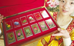 2009世界邮展于4月9日在河南省洛阳市开幕。为纪念这一活动,世界邮展组织方联合洛阳国家牡丹园,从上千个牡丹品种中精选魏紫、姚黄、赵粉、豆绿、洛阳红等品种为蓝本,经艺术设计加工,推出“玉镶金”工艺的《牡丹十二品》世界邮展牡丹主题特种收藏品。
