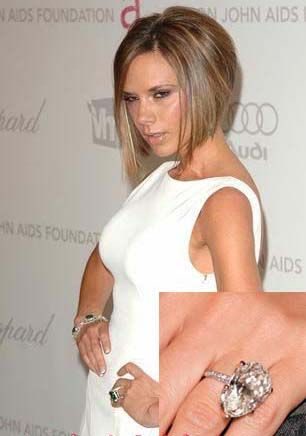 维多利亚和贝克汉姆从来都是高调的炫耀,炫耀他们的婚姻和幸福还有财产。维多利亚平日里的各种名贵手袋数不胜数,说到婚戒,就不得不说维多利亚的那只梨形戒指,这只婚戒是在结婚6周年纪念日上,小贝送给辣妹的戒指是一枚价值2万英镑的白色钻戒。