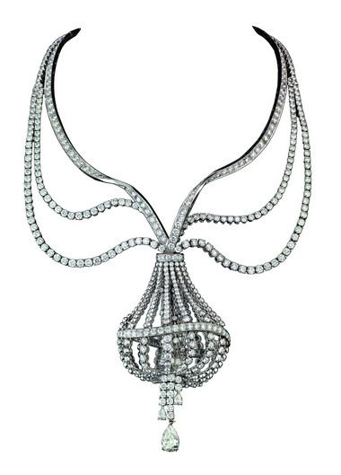 Satine珠宝套装的第三种款式,是一条优美的白金项链,吊灯形的吊坠散发永恒的优雅和令人愉悦的魅力。