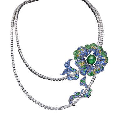 白金与黄金项链的主体,是宝石组成的波浪状裙襬,宛如Louise藉以成名的肯肯舞,兼有宝诗龙著名“Exquises Confidences”系列之流风余韵。裙襬掩映之下,是一颗完美无瑕的10克拉梨形切割祖母绿,由一群美钻蜷绕簇拥着;接着是一颗鲜艳有如火光、象征香槟泡沫涌出瓶口的3克拉梨形切割钻石,然后,酒泡流淌到胸口,便是另一颗3克拉梨形切割钻石。