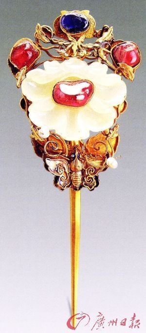 扬之水:有一定的关系,但只是原因之一。对宝石的热情,元代已经开始了——新朝统治者带来对所谓“回回石头”的喜爱,此风遂盛。郑和携归珠宝,或者可以说是推波助澜。湖北钟祥明梁庄王墓出土的金镶宝簪钗不妨作为一证。而《明史》卷八二《食货六》说到嘉靖中期以后,“太仓之银,颇取入承运库,办金宝珍珠,于是猫儿睛,祖母碌,石绿,撤孛尼石,红剌石,北河洗石,金刚钻,朱蓝石,紫英石,甘黄玉,无所不购。穆宗承之,购珠宝益急”;万历中,“帝日黩货,开采之议大兴,费以鉅万计,珠宝价增旧二十倍”;成书于万历年间的《五杂组》卷一二列举当日为世人所重的各种宝石,而曰“皆镶嵌首饰之用”,定陵以及大抵同时的藩王墓葬所出头面多以珠宝为饰,自然与这样的背景密切相关。