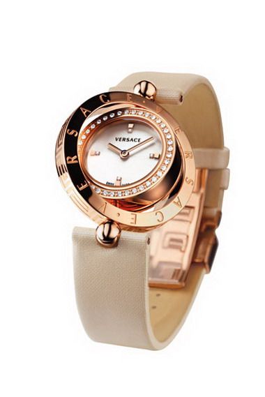 圆形表壳采用镀玫瑰金不锈钢精制,内为珍珠母表面,镶饰钻石时标,旋转外圈一侧以巴黎钉纹缀饰,另一侧刻上Versace标志。表带由镀玫瑰金的金属球组成,造型浪漫时尚,此外亦备有精巧的特别尊贵版,表壳镶饰钻石,配搭亮滑缎表带。