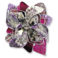 这款胸针饰以多种颜色的紫色水晶和搪瓷,如一朵盛开的鲜花,紫罗兰色,波尔多红色和粉色花瓣交错生辉。