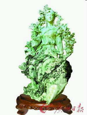 由澳门雕塑院院长、江门籍著名雕塑家梁晚年为庆祝澳门回归祖国十周年创作的重3.8吨妈祖翡翠玉雕,将于今年11月作为澳门回归十周年赠予国家的贺礼,捐赠给北京人民大会堂珍藏。这具玉雕以中国著名历史人物妈祖造像的艺术精品,取名《滴翠盈银》。玉雕已于今年3月完工,8月初运往澳门,在澳门渔人码头举行预展。