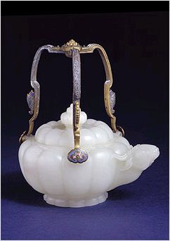 玉壶是清代宫廷重要的生活用品之一,样式极多,除羊首壶外,尚有凤首壶、龙首壶等,还有与玉杯、盘成套者。此壶以瓜棱形作器身,以羊首作流,结合了动物和植物的题材,又将玉器的素净与珐琅的斑斓集于一器,造型新颖别致,从质地到作工均属上乘,为清嘉庆时期不可多得的艺术珍品。