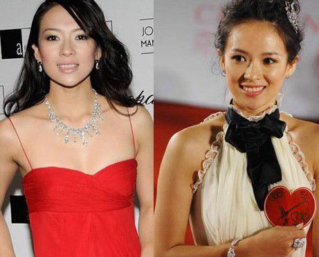 (左)一身红裙出席第10届White Tie &Tiara周年舞会,衬以鲜红色的晚装,章子怡选佩了完美的钻石项链缀以共98.18卡拉精致的钻石,长梨形的钻石耳环(共6.59卡拉)及镶满白金钻石的手镯(共7.99卡拉)。