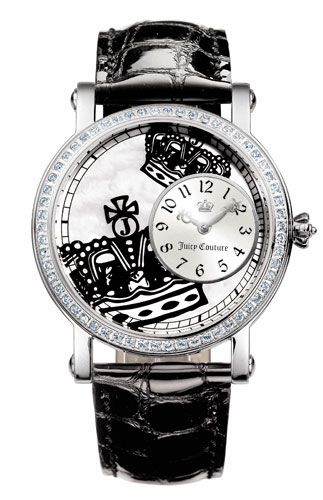 这款Juicy Couture 手表用皇冠图案作为设计基础,配衬黑色压纹真皮皮带,最独之处是时分盘靠右放置,加上品牌独的G & P 指针,充满创意玩味,表圈镶满闪烁施华洛世奇水晶,夺目而充满少女味道, 珍珠贝母表盘上的皇冠图案同时立体地演绎于表冠上, 非常可爱。