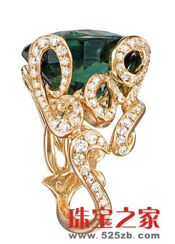 透过Victoire的童心与巧思,La Bague系列饶富幽默趣味与艺术风尚;细密钻石流动于草写字母间,令每一件作品在指间摆动时散发隐隐波光,衬托碧玺迷人色泽。 从系列名称到设计,La Bague系列充分展现设计师的功力与一贯的幽默 - 这是一枚戒指!