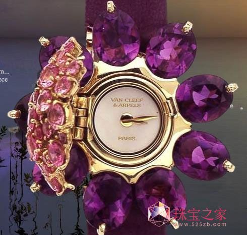 由紫色水晶以及粉红色尖晶石组成的艳丽紫色花朵,打开花心就变成一只精美的女装腕表,独具匠心的设计,让你不忍放弃。