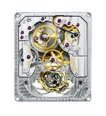 与普通陀飞轮结构完全不同的陀飞轮,绝对算是独特设计与高超技艺的完美结合。从视觉上来看,平置的框架每分钟环绕表盘中心运行一周。呈箭头形状的陀飞轮框架偏离中心,指示秒钟。在技术上,为了保证框架的平衡,在框架的另一端加载一个铂金平衡块,并隐藏在中心表盘下。此外,为了在框架旋转时抵消惯性,必须对框架重量加以限制,所以制表师们选择了钛金属制造陀飞轮框架。