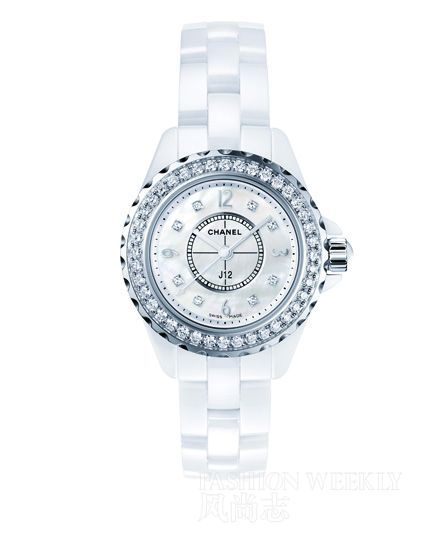 2000年,Chanel J12首次以璀璨优雅的形态诠释顶级腕表新美学。2010年新发表的J12顶级限量腕表,以18K白金表身搭配高科技精密陶瓷,表圈同样镶以46颗长阶梯形切割精密陶瓷,表盘镶嵌84颗长阶梯形切割总量2克拉钻石,时标镶嵌12颗红宝石。