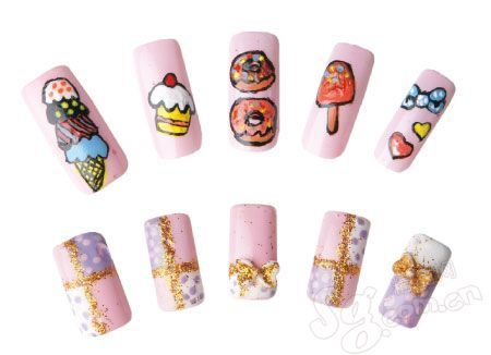 必备彩绘指甲:各色各样的雕花、粉嫩色彩、冰淇淋等可爱图案