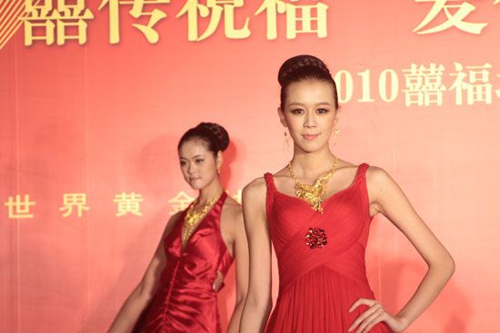 2010年,世界黄金协会携手菜百公司,以及中国众多久负盛名的零售商,倾力打造“囍福”新篇章,意在进一步拓展婚庆市场,致力将传统婚俗文化植根在中华大地。2010年囍福结婚金饰新品,以“唯有金•囍传祝福”为主题,让幸福代代传承。会中盛邀中国传统婚俗文化传承人高巍先生,菜百公司领导以及世界黄金协会唯有金项目总监陈志君先生一起就婚俗文化与结婚金饰设计及发展,展开了生动诙谐的沙龙座谈,几位嘉宾更是现身说法讲述自己当年的婚路历程,场面温馨,喜气融融。随后著名造型师老黑带来的结婚金饰与礼服搭配技巧让在座来宾也受益匪浅,在这喜悦的时刻,模特身着设计风格迥异的婚纱礼服现场搭配展示了12套喜福结婚金饰,让现代的新娘充分感受了传统与时尚融汇并重的永恒魅力。