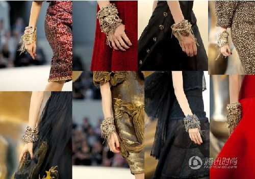 这一次颇为喜欢这个华丽的手饰,充满了俄罗斯罗曼诺夫皇朝统治时期的壮丽和奢华,前面几套再平庸的套装因为有手上这奢华手饰的点缀一样还是能吸引人的眼球。我一向对Chanel是又爱又狠,今年的春夏和秋冬两季的秀场布置都很别致,不管是春夏的田园风还是秋冬的北极熊风格都让我喜爱有加。可是换到了高订不说春夏的淡粉淡绿淡蓝淡黄这些粉不拉几的颜色,还有那个蝴蝶结的头饰,实在让我要崩溃了。这一次秋冬高订前面几套套装也让我崩溃了,还好后面的奢华宫廷装终于让这场秀高订起来了。特别是刘雯同学穿的这套白色及膝裙真是太漂亮了跟F穿的那套蓝色比起来,我个人比较爱刘雯同学的这身。