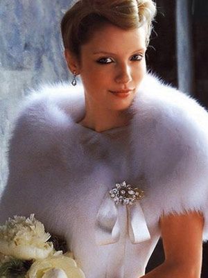将柔滑的皮草搭在肩上,高贵典雅的气质立刻显现,只在胸前搭配上一朵金属缎带花朵的胸针,便将皮草和婚纱完美的结合在一起,即使在冷的冬天,美丽的新娘也不畏惧。