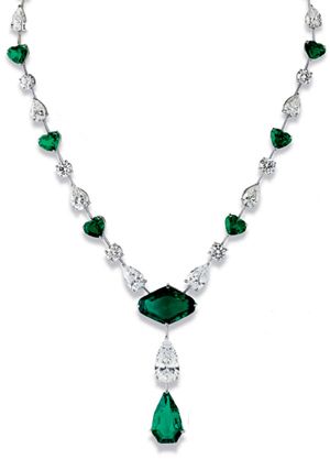 Graff铂金镶嵌祖母绿及钻石项链这款新娘吊坠式项链的设计很简单也很具有优雅的味道,钻石镶嵌的铂金材质与祖母绿宝石将新娘的颈间衬托的格外优雅与动人。