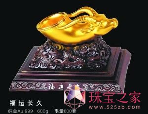 北京工美集团有限责任公司推出的千足金福运长久牛首杯系采用濒危的传统手工花丝技艺打造,取其福运“酒”牛之寓意,以600克千足金为质材再现大唐之重宝镶金兽首玛瑙杯的风采,全球限量发行600尊。市场售价为24.96万元。