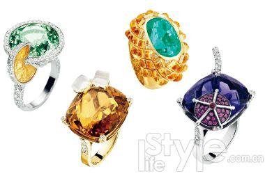 既然名称是鸡尾酒戒指,自然必须要强调如鸡尾酒一般瑰丽多彩的颜色。因此,在整体设计上,Cocktail Ring必然会选择以各种颜色的宝石或者半宝石作为造型的绝对主体,在主石的旁边,辅以其他各种颜色的小型宝石。造型前卫多样,凸显个性,佩戴方式也变得 随性,单个或多个,左、右手都不拘,但通常仍会避开用来戴婚戒的左手无名指。