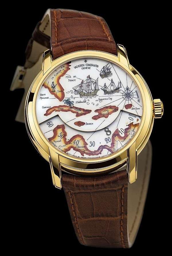 将世界上最伟大的探险家们的故事淋漓尽致的展现在腕表表盘上是个高难度的创举,这对于技术和美学构成方面有著严格、苛刻的要求。而江诗丹顿做到了这些。「高温明火」彩色珐琅表盘由上下两层组成,且部分重叠。上层绘有部分世界地图,重现与探险家们航程路线相关的历史足迹,下层表盘为一个132度宽的的弧形。12小时数位标度则以顺时针方向在下层表盘的扇形分钟刻度盘内移动,凸显出最精湛的钟表传统工艺以及真正令人惊歎的複杂性能。