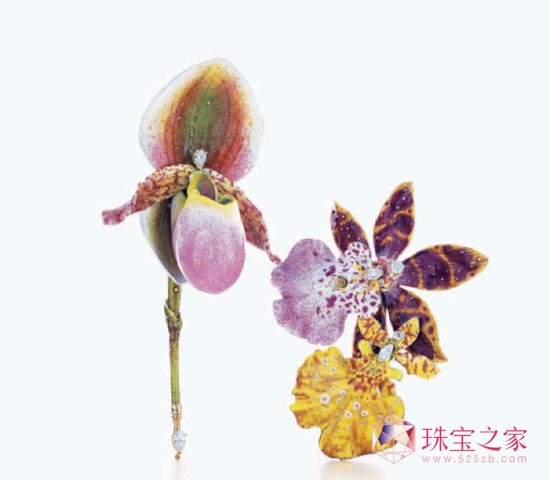 如果你喜爱兰花,那么你对这款由19世纪TIFFANY著名的设计师波尔丁法纳姆设计的胸针绝对爱不释手,使用真正的兰花浸蜡、珐琅、煅烧、抛光后,镶嵌钻石而成,一个真实的花之君子,搭配着一位翩翩起舞的佳人,谁敢说不是一场绝配?