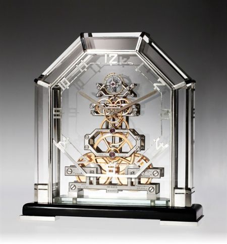 搭载Philippe René Jaccard's 1930年的专利恒久动力擒纵系统,孤品,典型的装饰艺术风格,无色水晶和铬为主要材质,镂空设计。