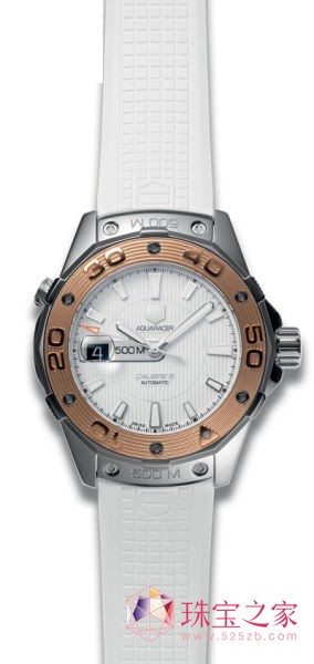 潜水表也可以很飘逸。配上白色橡胶细格纹带的不锈钢Aquaracer,旋转外框是温厚的玫瑰金,上面的计分刻度是立体金字,背景是深刻的同心圆纹。表盘以白色夜光指针衬白色夜光时标,上面直纹修饰,荡漾海波时是名副其实的“浪里白条”。日期窗特立独行地开在9时位置,黑底白字的设定在白背景下脱颖而出。中置秒针顶上橙色箭头,丰富了表盘的层次美。别看它书生味浓,却强得可以下探500米深海。
