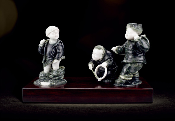 此次春拍标的中,还有一部分以独特创意和精细工艺为代表的小巧作品吸引了众多藏友的关注。其中,独山玉雕名家张克钊创作的“独山玉童年摆件”和“纸飞机摆件”深得大家的喜爱,童子生动的表情、自然的体态,独山玉丰富的颜色让大家在享受了和田玉的精美含蓄的韵味之后又领略了别具特色的农家生活气息。此件“独山玉童年”则以无底价起拍,经过25轮激烈竞价,最终以103040元,成为本场无底价拍卖的最高价。