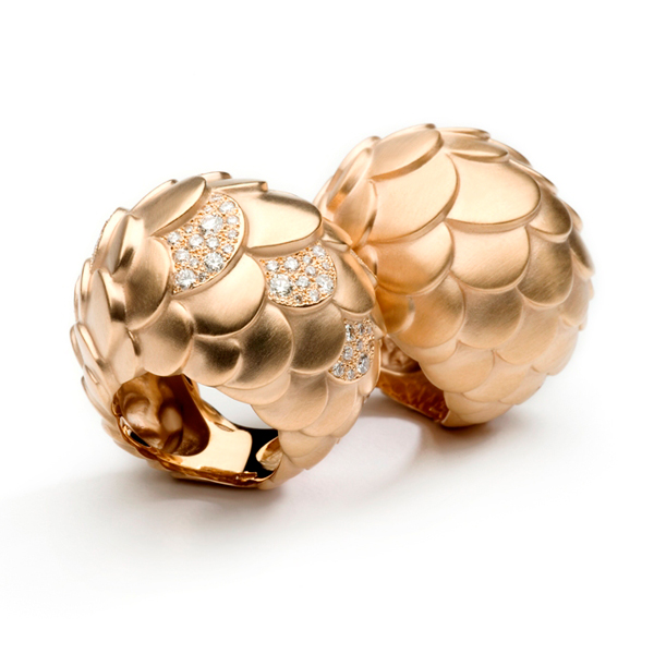 迷人的Sirene系列手镯和戒指选用了玫瑰金材质打造出三维立体图案,宛若美人鱼灵动柔美的尾部鳞纹,点缀以水滴般晶莹剔透的钻石。