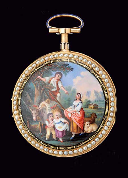 现在高科技制表风气横行,人的作用几乎减到史上最低位,只有石英时代可堪比拟。多数表是冷冰冰的,没有了人气带出的艺术氛围。全人手绘画的珐琅 表,给人温暖的感觉,值得欣赏把玩。对此有兴趣的朋友可到日内瓦百达翡丽博物馆走一圈,那里藏有二三十只从上世纪60年代到80年代创作的珐琅怀表。我看 过之后,突然有“悟”的感受,做一只万年历计时表难吗?难。但与这个级别的缩绘珐琅表相比,那又实在太容易了。因为做高复杂表的机器和人不难寻找,而能画 出这种珐琅画的屈指可数。