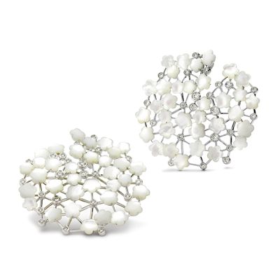 曾获得英国Lomin奖,边缘精巧的钻石点缀镶嵌在18K白金上,立体效果的花形外观。