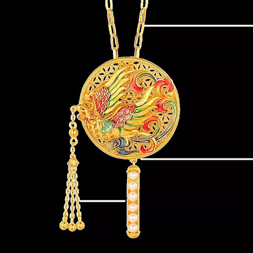 将古扇精髓提炼再设计,结合传统金器制作技艺中燕京八绝的花丝工艺、珐琅彩工艺精制而成,并将胸针、吊坠两用的创新佩戴方式融为一体,使其具有更多实用功能。