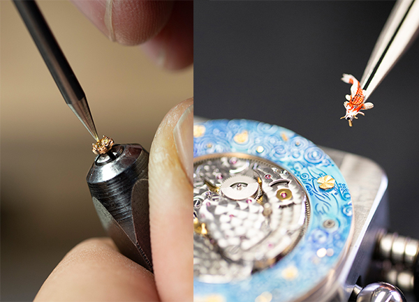 此活动圆盘包含两个精妙非凡的活动场景。第一个是活动锦鲤。锦鲤以意喻长寿而著称,象征着勇敢和坚韧,在水中灵动游弋。雅克德罗(Jaquet Droz)通过精细的微缩活动装置,令锦鲤可实现两种运动:锦鲤可摆动尾部,犹如在水中向前游动;亦可上下浮动,在流动的河水中自在潜游,并可下潜到莲叶下方。