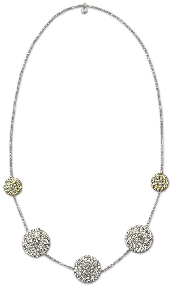 精心打造的镀白金色长项链上,缀有五个带透明或金色仿水晶的仿水晶网布圆球装饰。由黑色丝带与镀白金色元素组成的短项链上,缀有透明及金色的仿水晶网布圆球装饰。