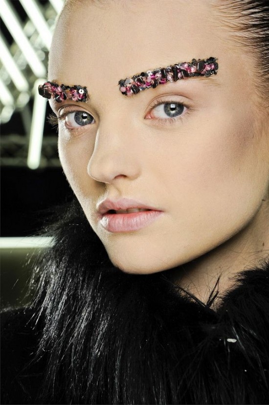 香奈儿CHANEL 2012-13秋冬高级成衣系列发布会上,彩妆创意总监Peter Phillips创造了眉毛迷人的珠宝组合,将水晶、珍珠和亮片等结合到一起,精心手工制作出了眉珠宝,并将其运用到模特们的彩妆中。