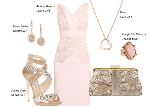 淡粉色连身+珠宝亮片装饰鞋包,清淡的华丽感,浪漫公主范儿。
