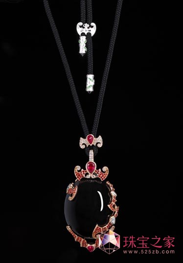 一粒饱满的墨翠蛋面,拥有的浓郁黑色,在设计师眼中变成了充满神秘的黑色洞穴。想象一束光突然之间射进来,沉睡的蝙蝠纷纷扑翅而飞,这个神秘又刺激的场景,被设计师订个在了这款个性十足的挂坠之上。墨翠上五只扑翅欲飞的蝙蝠由渐变的橙色、红色蓝宝石和钻石镶嵌而成,五只蝙蝠象征“五福”——长寿、富御、健康、好善和名誉。