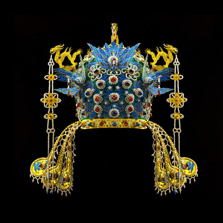 这项凤冠造型庄重,冠上镶嵌龙、凤、珠宝花、翠云、翠叶及博鬓,皆先单独做成,插嵌在冠上的插套内组合而成。一眼望去,凤冠上金龙升腾奔跃在翠云之上,翠凤展翅飞翔在珠宝花叶之中,龙凤口衔珠宝串饰,金龙、翠凤、珠光宝气交相辉映,十分富丽。