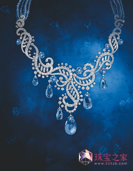 绝世珍宝由铂金、钻石及蓝宝石精心打造,7颗共重95.57克拉雕刻花朵图案的梨形切割蓝宝石悬垂于光彩夺目的钻石之下,明亮切割及长方形切割钻石装点着跃动的朵朵浪花。